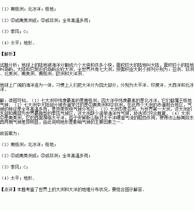 (1)七大洲中纬度最高的是 ,四大洋中纬度最高的是 ,它们都属于 气候.