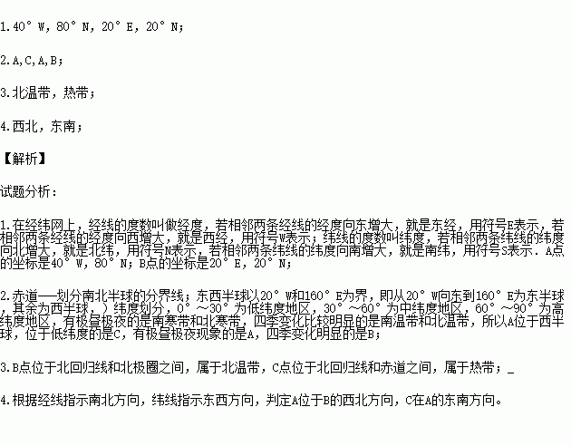 2.图中各点,位于西半球的是_________,位于低纬度的是_________,有极昼极夜现象的是_____________,四季变化明显的是_____________。