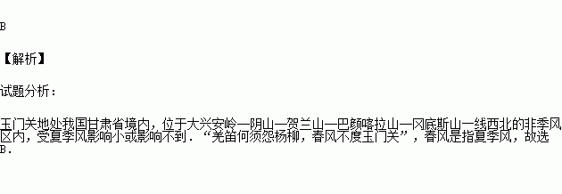 某校课外兴趣小组在讨论“羌笛何须怨杨柳,春风不度玉门关”这首名诗中的“春风”时,讨论很激烈。从地理角度你认为“春风”应指( )
