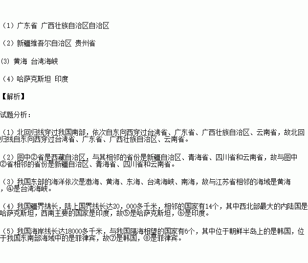 (5)我国海岸线长达18000多千米,与我国隔海相望的国家有6个,其中⑦是 (国家);⑧是 (国家)。