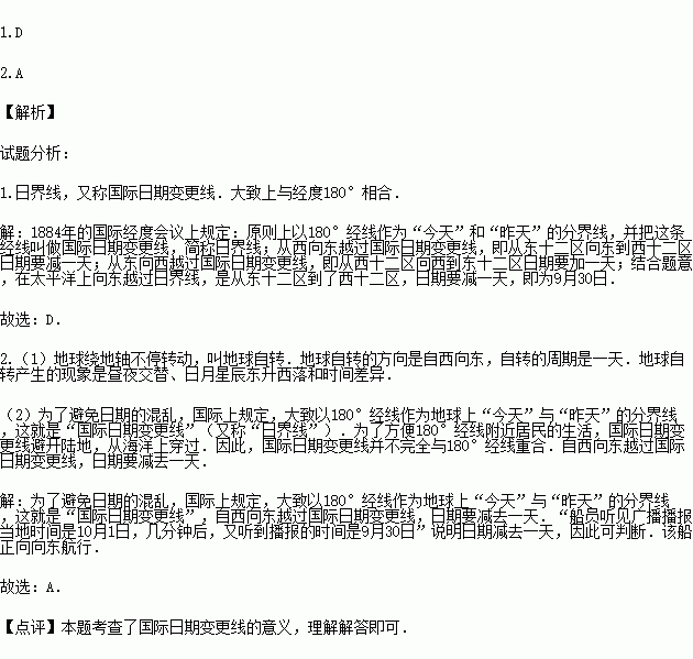 轮船航行在太平洋某处,该船船员听见广播播报当地时间是10月1日,几分钟后,又听到播报的时间是9月30日.据此完成问题.