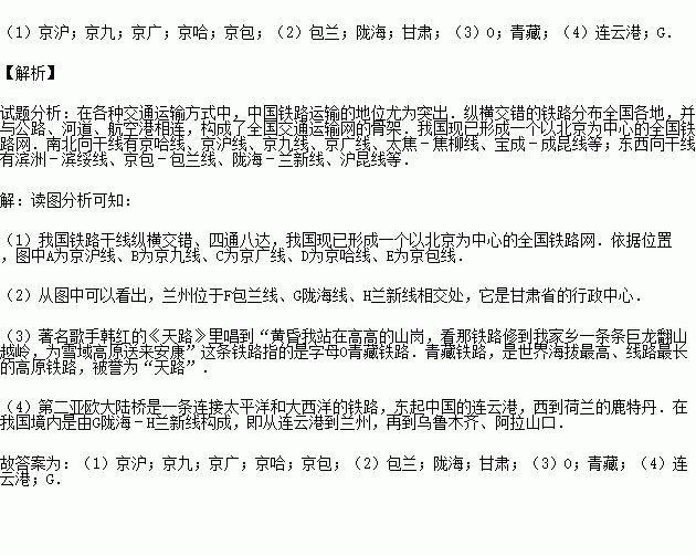 (3)著名歌手韩红的《天路》里唱到“黄昏我站在高高的山岗,看那铁路修到我家乡一条条巨龙翻山越岭,为雪域高原送来安康”这条铁路指的是字母 是 铁路.