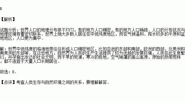 某同学编写了一段顺口溜﹣﹣“高纬高山①,沙漠内陆②,雨林湿又③,人们定居难.”以下选项最能反映世界人口分布特点及成因的是( )