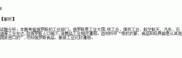 小明的爸爸刚从俄罗斯回来,对他说:“俄罗斯许多产品产量居世界前列。”但是给他带的衣服、食品和玩具都是从其他国家进口的。这说明俄罗斯比较薄弱的工业部门是 ( )