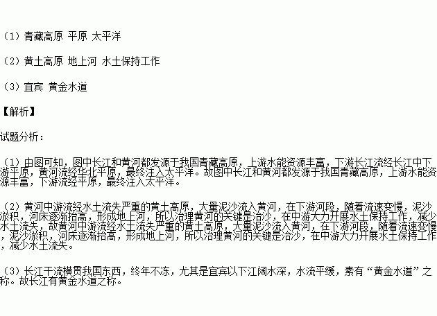 (1)长江、黄河,都发源于 高原,上游水能资源丰富,下游流经 地区,最后注入 洋。