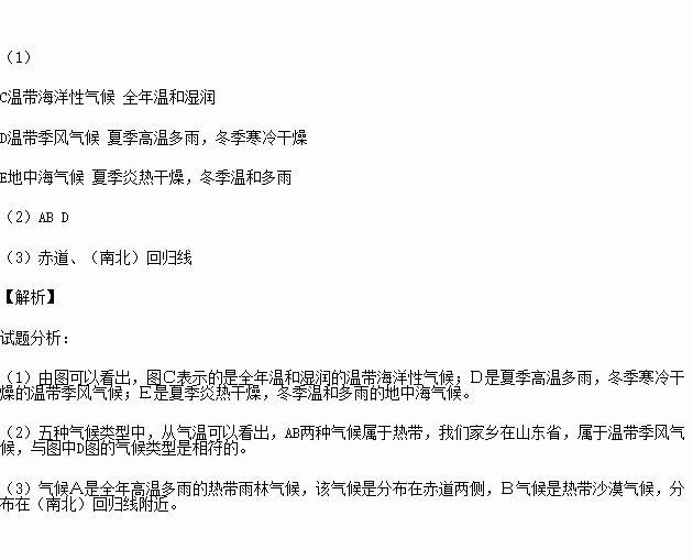 (2)五种气候类型中,属于热带的有____ __;气温和降水状况与咱家乡相似的是___ _。(填字母)