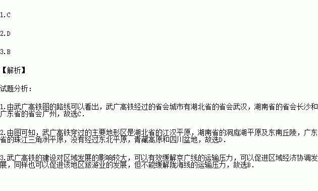 2009年12月26日,全长l068.6千米的武(汉)至广(州)高速铁路正式投入运营。重要性不仅在于它是迄今为止世界上一次建成里程最长、运营速度最高的高速铁路,更在于它有望成为改写粤湘鄂三省经济版图、塑造沿线经济新生活的黄金大动脉。根据图文回答下列问题.