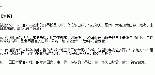 D.丁国日本是亚洲唯一的发达国家,岛上多火山地震