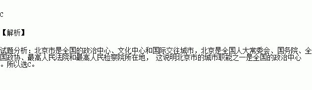 北京是全国人大常委会、国务院、全国政协、最高人民法院和最高人民检察院所在地,这说明北京市的城市职能之一是全国的