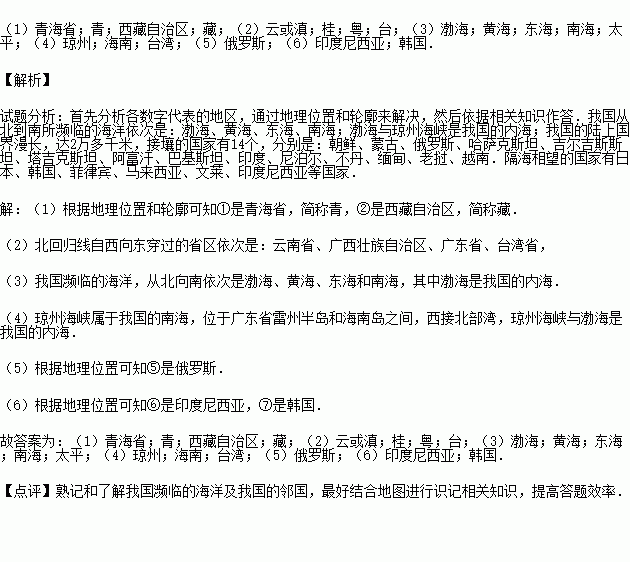 £¨6£©ÎÒ¹úº£°¶Ïß³¤´ï18000¶àǧÃ×£¬ÓëÎÒ¹ú¸ôº£ÏàÍûµÄ¹ú¼ÒÓÐ6¸ö£¬ÆäÖТÞÊÇ £¨¹ú¼Ò£©£¬¢ßÊÇ £¨¹ú¼Ò£©£®