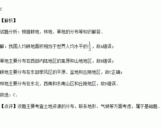 C.耕地主要分布在东部季风区的平原、盆地和丘陵地区