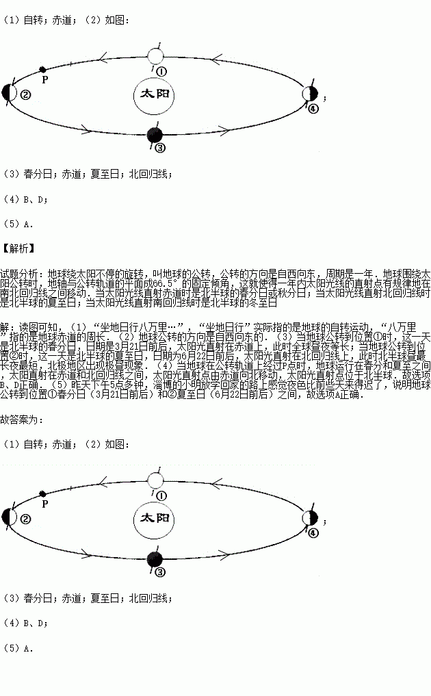 (5)昨天下午5点多钟,淄博的小明放学回家的路上感觉夜色比前些天来得迟了,现在地球运行在 之间.