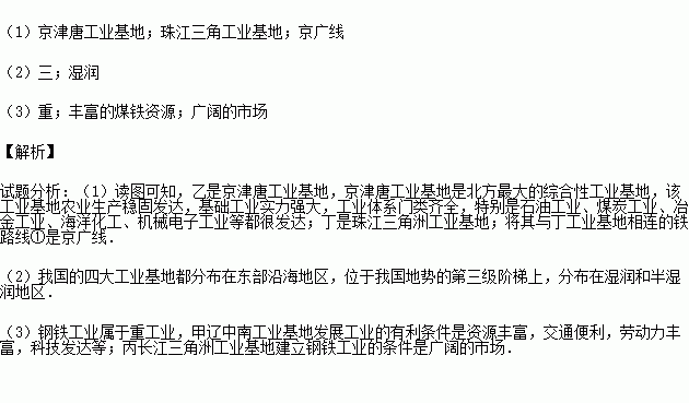 (1)图中甲、乙、丙、丁代表我国四大主要工业基地,其中乙工业基地是 ,丁工业基地是 ,将乙与丁两工业基地相连的铁路线①是 。