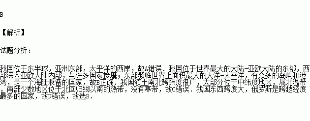 关于我国地理位置的叙述,正确的是 ( )