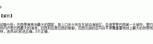 B.小毅认为巴西人口主要分布在东南部沿海地区