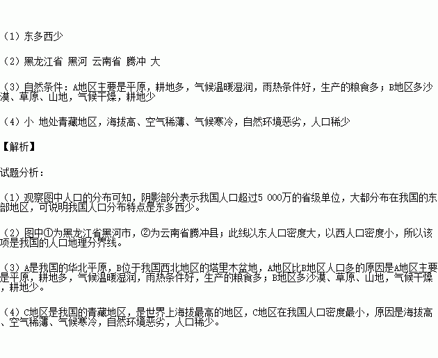 (1)阴影部分表示我国人口超过5 000万的省级单位,可说明我国人口分布特点是____________________。
