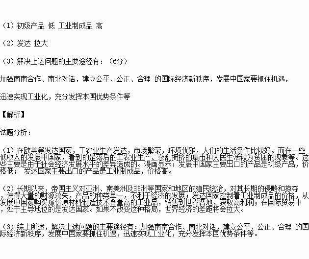 (1)漫画显示:发展中国家主要出口的产品是____________,价格____(高低);发达国家主要出口的产品是_____________,价格____(高/低)。