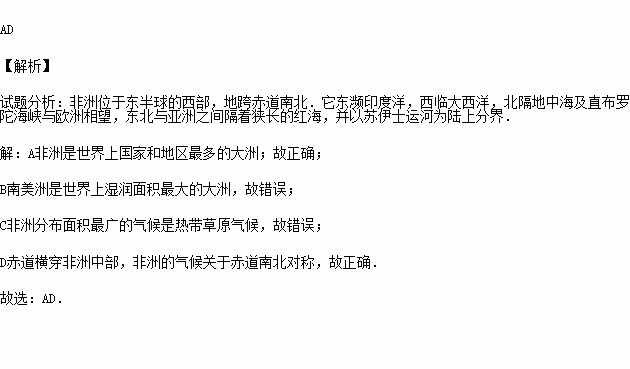 B.非洲大部分位于热带,是世界上湿润面积最大的大洲
