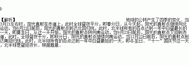 五一小长假期间,小明随父母到青岛世界园艺博览会游览,此时地球公转至图示所示的什么位置?( )