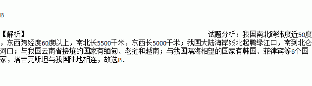 A. 我国南北跨纬度近50度,东西跨经度60度以上,因此东西距离大于南北距离