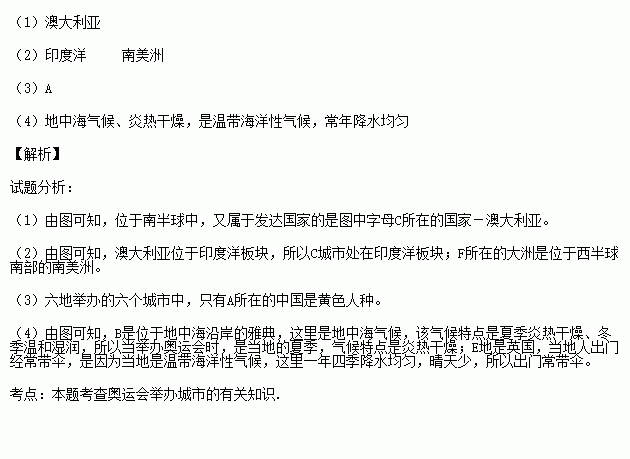 (2)图中A、B、C、D、E、F代表第26~31届奥运会举办地,其中城市C所处板块是 板块;城市F所在大洲是________洲。