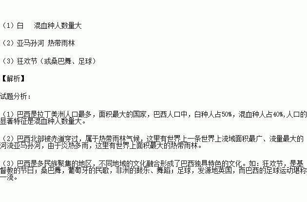 (3)来自不同地域的文化融合、发展,形成了具有特色的巴西文化,试举一例 。