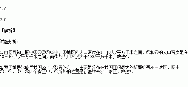 1.①②③④省中人口密度最大的是
