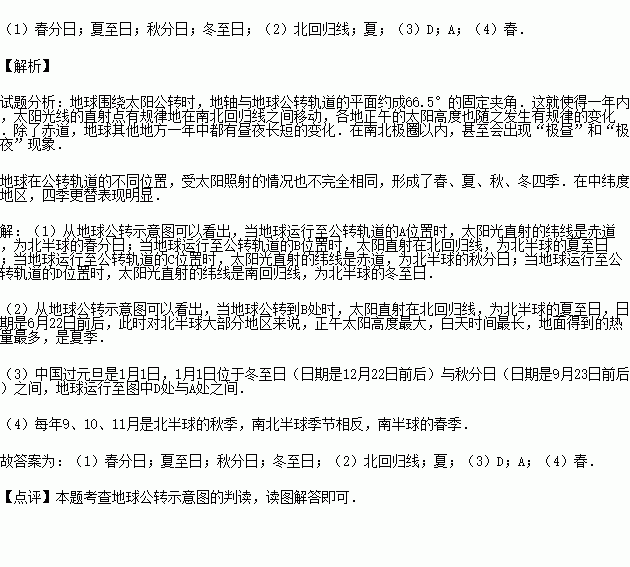 (1)图中A、B、C、D四处代表的节气名称.