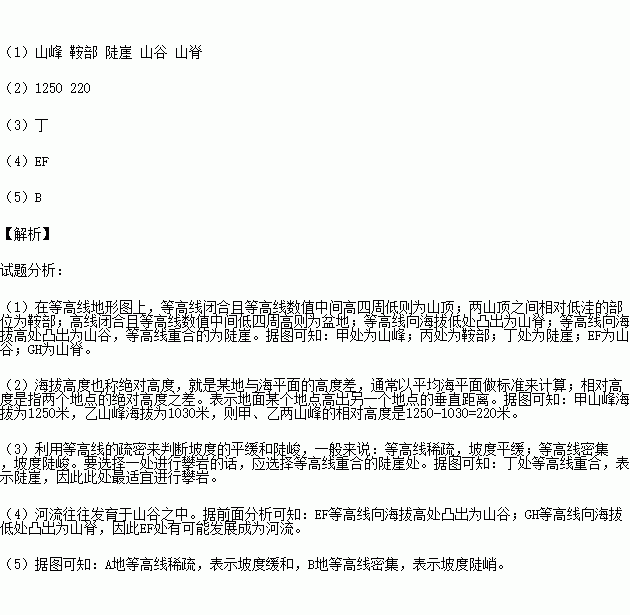 A、山脊,等高线向高处凸出 B、山谷,等高线向高处凸出