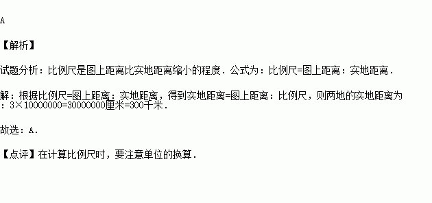如果在地图上量得两地间的直线距离为3厘米,图上比例1:10000000,算得两地间实地距离大约是( )