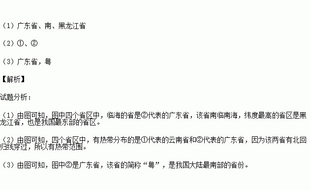 (2)四个省中,有热带分布的是: 、 。(写序号)