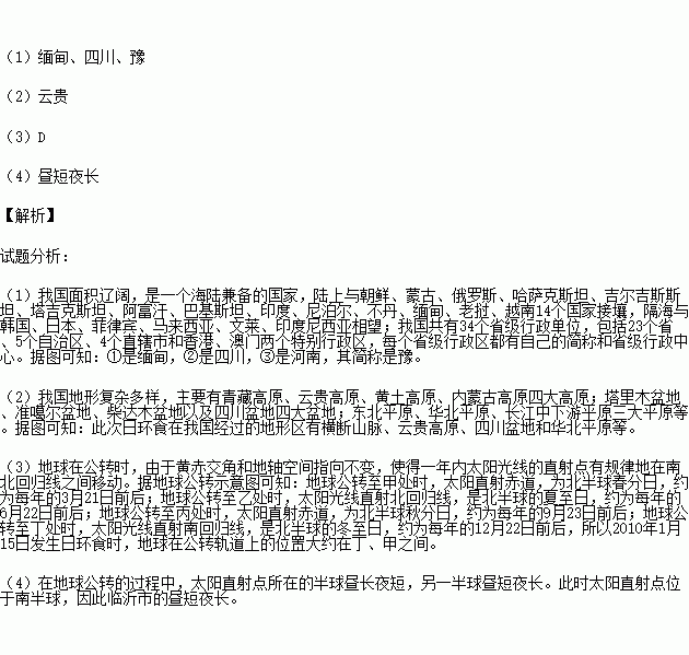 (2)日环食在我国经过的地形区有横断山脉、 高原、四川盆地和华北平原等。