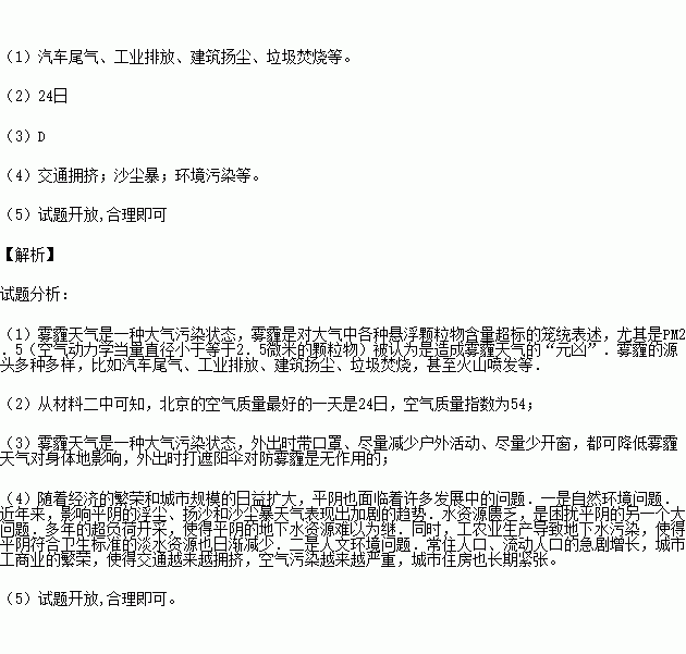 材料一:2015年平阴两会召开前的网络民意调查显示,如何破解“十面霾伏”,消除百姓“心肺之患”等热点问题备受关注。雾霾天气是一种大气污染状态,雾霾是对大气中各种悬浮颗粒物含量超标的笼统表述,尤其是PM2.5(空气动力学当量直径小于等于2.5微米的颗粒物)被认为是造成雾霾天气的“元凶”。雾霾的源头多种多样,比如汽车尾气、工业排放、建筑扬尘、垃圾焚烧等。