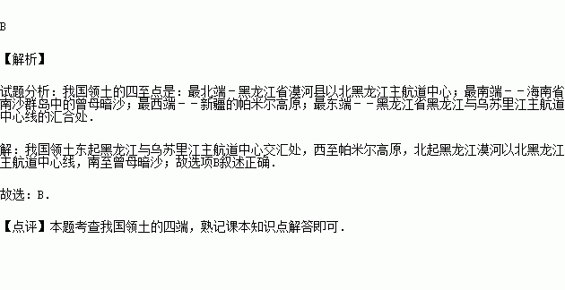 D.东起黑龙江与乌苏里江主航道中心交汇处西至帕米尔高原,北起黑河市南至天涯海角