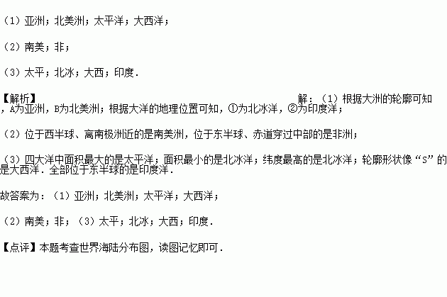 (3)四大洋中,面积最大的是 洋;纬度最高的是 洋;轮廓形状像“S”的是 洋;全部位于东半球的是 洋.