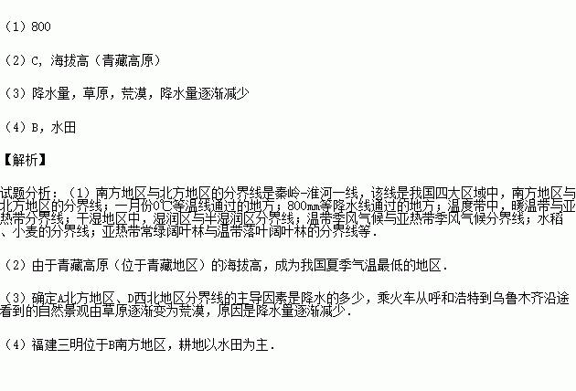 (1)A地区与B地区的分界线大致与0℃等温线及 毫米等降水量线重合。