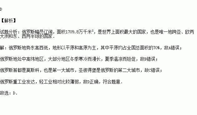 D.俄罗斯重工业发达,轻工业相对比较薄弱