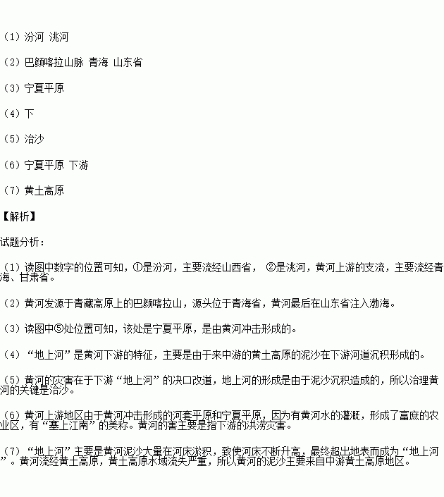 (7)“地上河”主要是黄河泥沙大量在河床淤积,致使河床不断升高,最终超出地表而成为“地上河”。黄河的泥沙主要来自 地区。