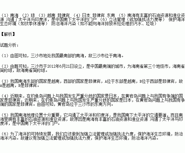 三沙市于2012年6月21日设立,是中国最南端的城市,为海南省第三个地级市,下辖西沙群岛、南沙群岛、中沙群岛的岛礁及其海域。读下左图回答下列问题。
