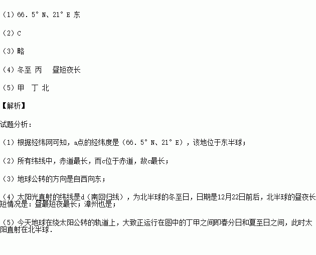(5)今天,地球运行在公转轨道甲、乙、丙、丁四点中的 和 之间,太阳直射在 (南、北)半球。