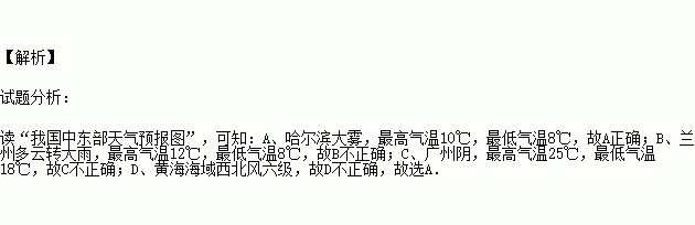 A.哈尔滨大雾,最高气温10℃,最低气温8℃