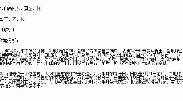1.地球公转的方向是。地球公转到甲位置时是北半球二分二至日中的日;地球从乙位置公转到丙位置的过程中,泰州地区的气温逐渐变。