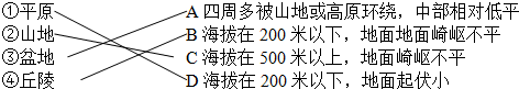 解答 解:人们通常把陆地地形分为平原、高原、山地、丘陵和盆地五种基本类型.平原和高原的共特点是地面起伏小;不同点是平原海拔较低,一般在200米下,而高原海拔较高,边缘比较陡峭.山地和丘陵的同特点是地形崎岖;不同点是山地海拔较高,在500米以上,坡度较陡,沟谷较深,而丘陵海拔较低,相对高度一不超过200米;盆地四周高,中间低.故答案为:.