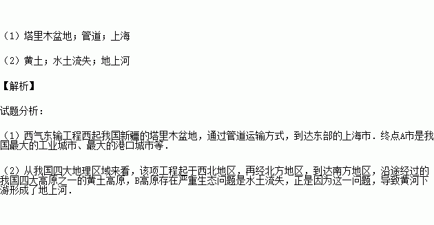 (1)西气东输工程西起我国新疆的 (地形区),通过 运输方式,到达东部的 市(A).