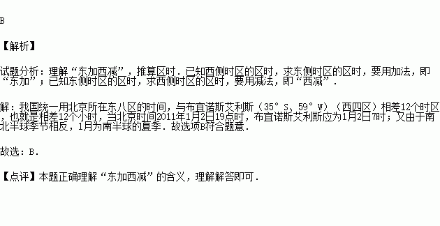 北京时间2013年1月2日19点小明在深圳给在布宜诺斯艾利斯(35°S、59°W)工作的父亲打电话,语言表达正确的是( )