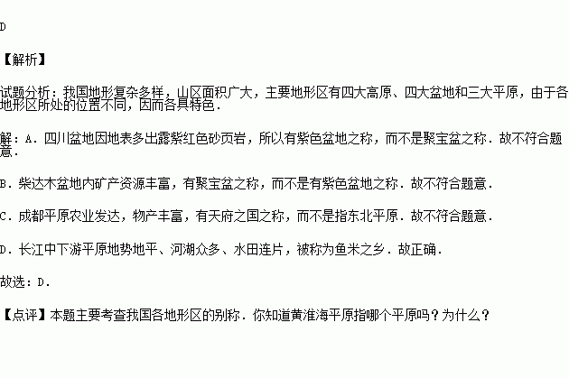 D.长江中下游平原﹣﹣“鱼米之乡”
