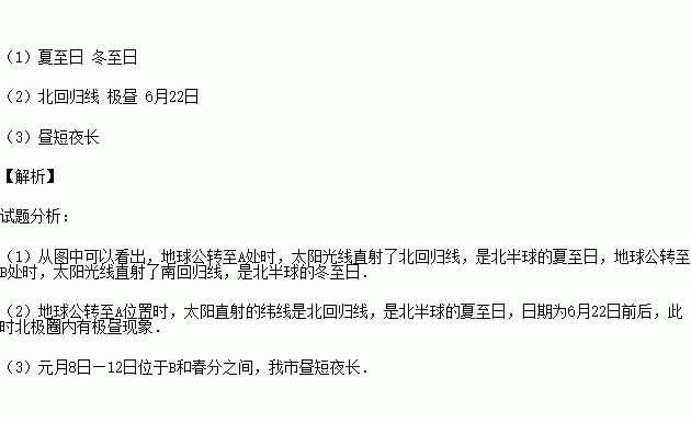 (1)写出地球公转至A、B位置时北半球的节气:A ,B 。