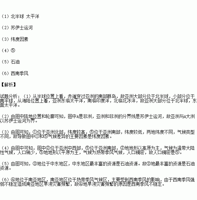 (6)④地旱涝灾害频繁,主要原因是 (风向)季风不稳定导致。