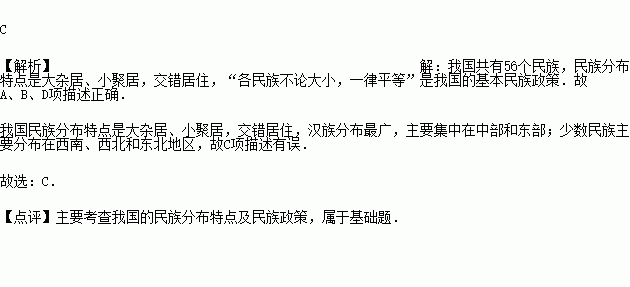 C.各民族均匀分布 D.民族分布“大杂居、小聚居”
