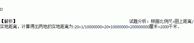 在比例尺为1∶10 000 000的地图上,量得AB两地的图上距离为20厘米,那么AB两地的实地距离是